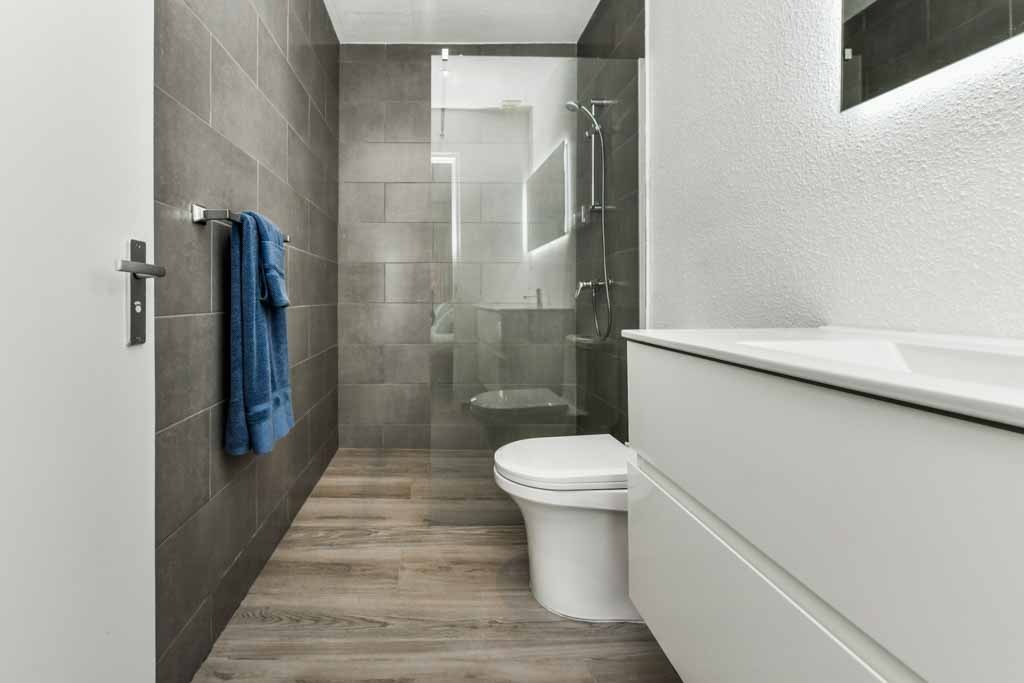 One-Bedroom Units: Spacious primary bedroom with a walk-in closet and en-suite bathroom featuring a walk-in shower, floating vanity, and ample storage.